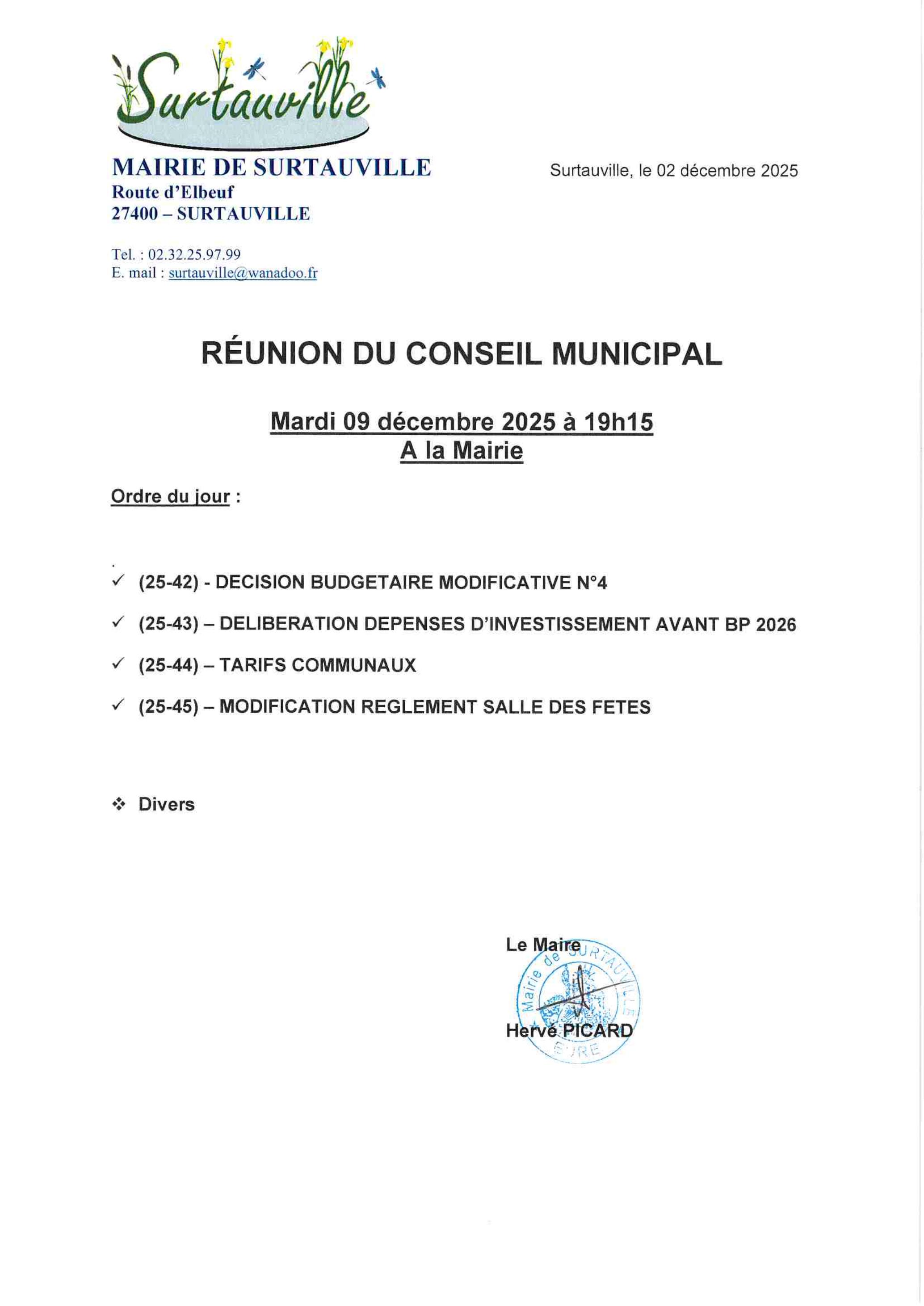 Vous êtes ici : Accueil > Réunion du conseil municipal du 09 décembre 2025