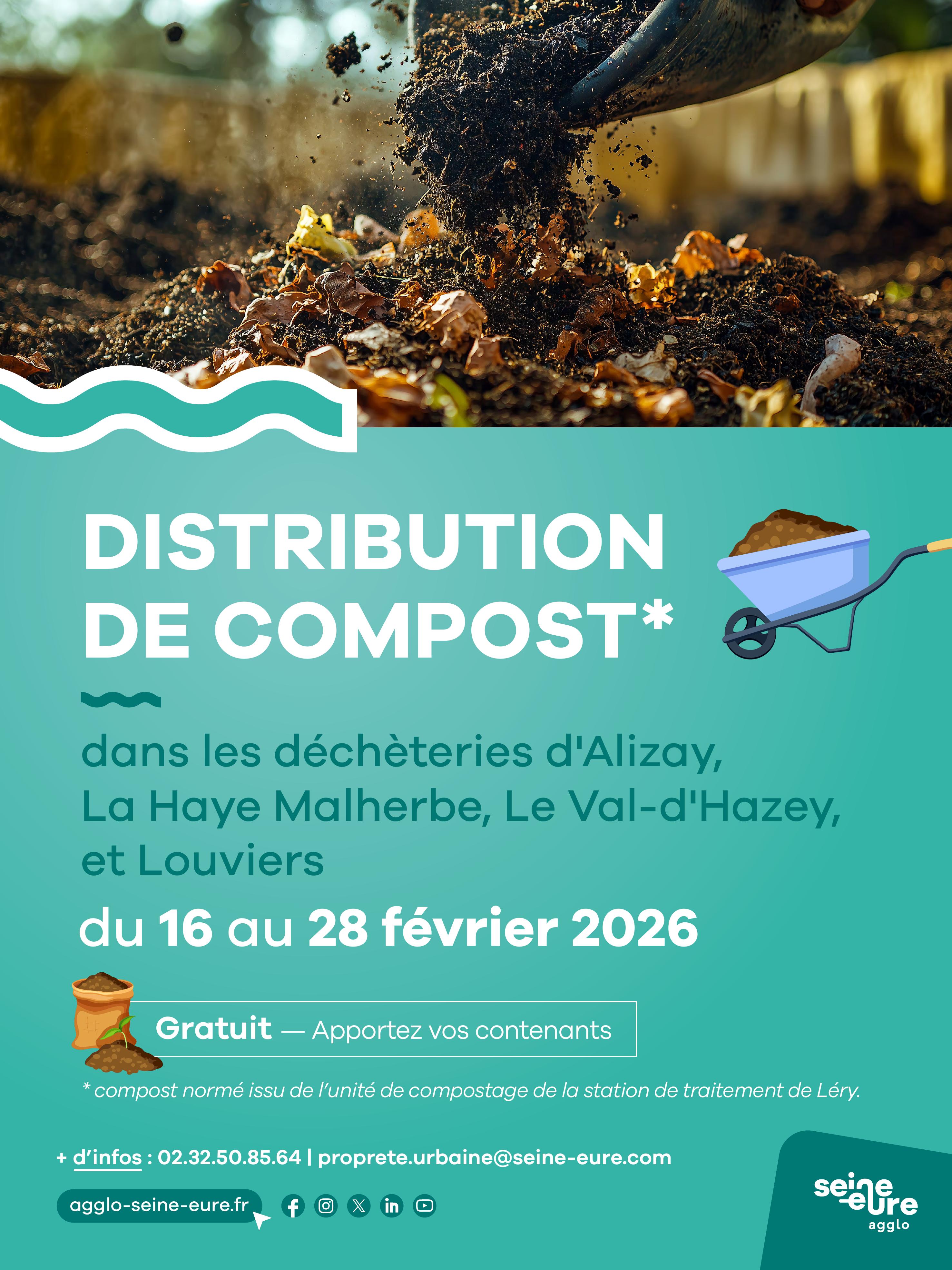 Une opération de compost aura lieu dans 4 déchèteries du territoire (Alizay, La Haye Malherbe, Le Val-d’Hazey et Louviers) du 16 au 28 février 2026.