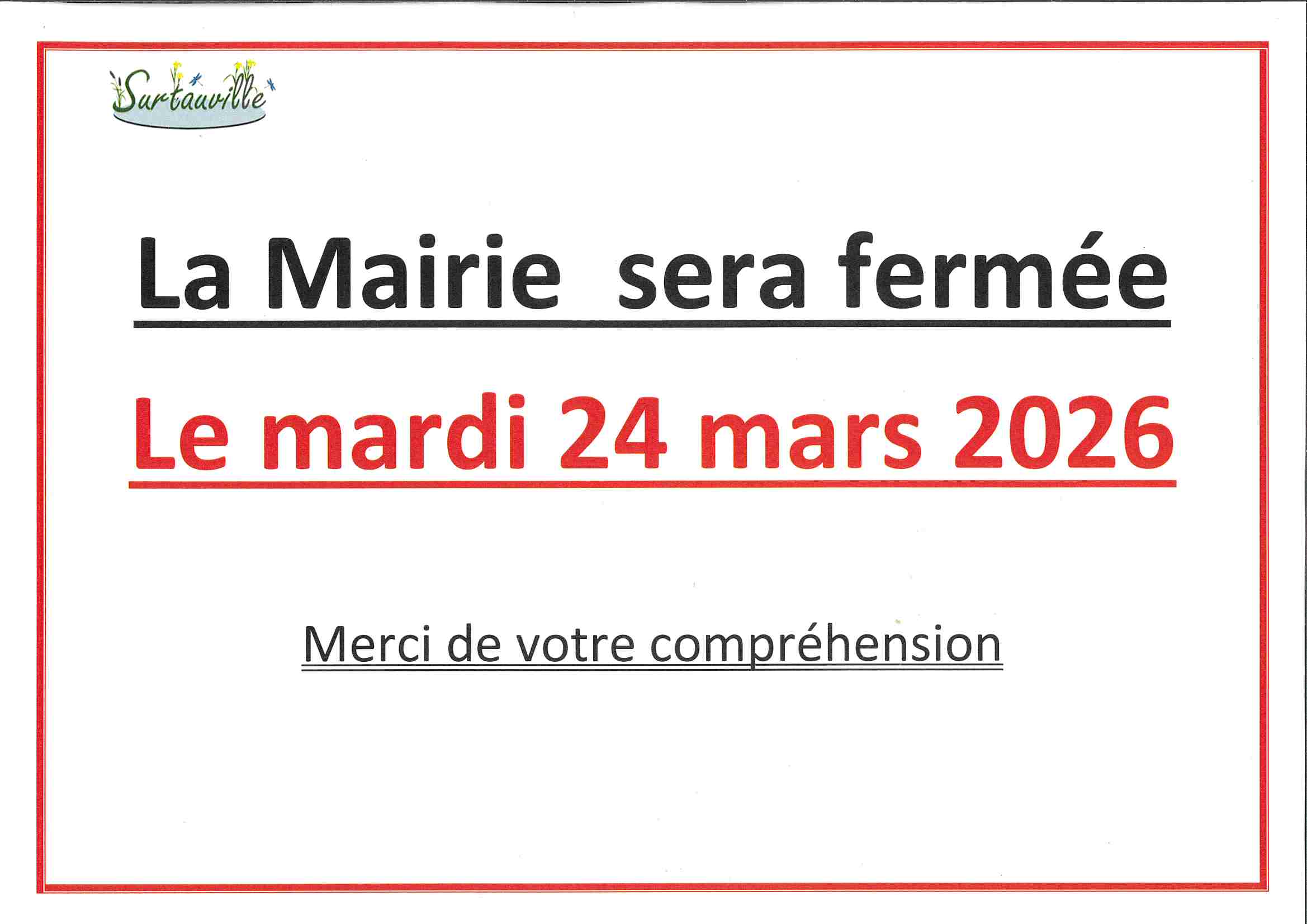 Vous êtes ici : Accueil > Fermeture exceptionnelle de la mairie